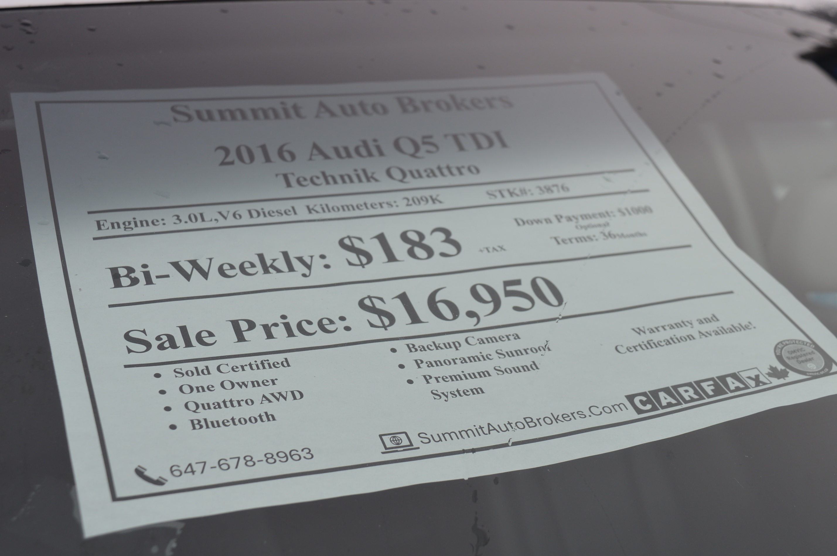 2016 Audi Q5 TDI 3.0L Technik Quattro – 209,300 KM Now Only $15,950(Was $16,950) or $230 Bi-Weekly(O.A.C.). Bi-weekly payment includes certification package.