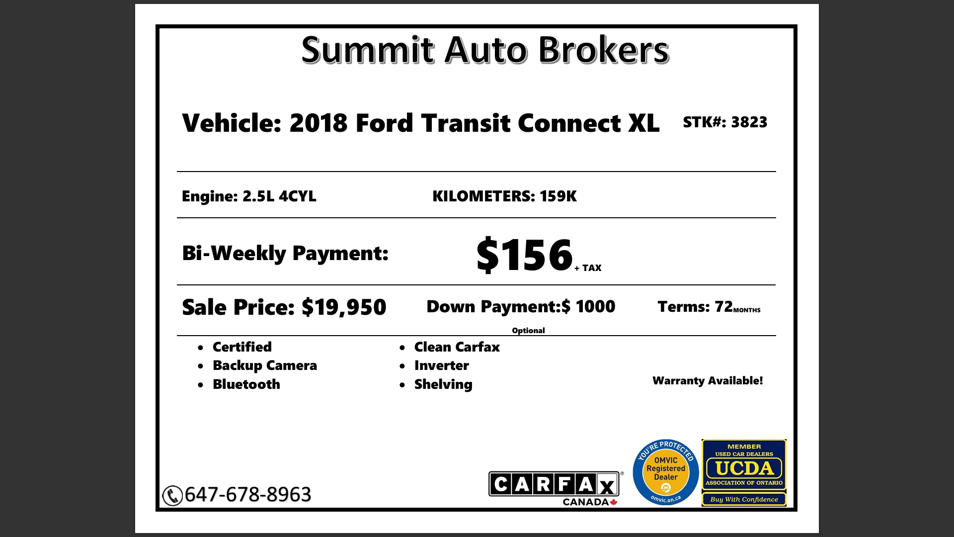 Summit Auto Brokers is an OMVIC Ontario Registered Dealer (buy with Confidence) and proud member of UCDA, Carfax Canada we have been in business since 1989 and client satisfaction is our priority.